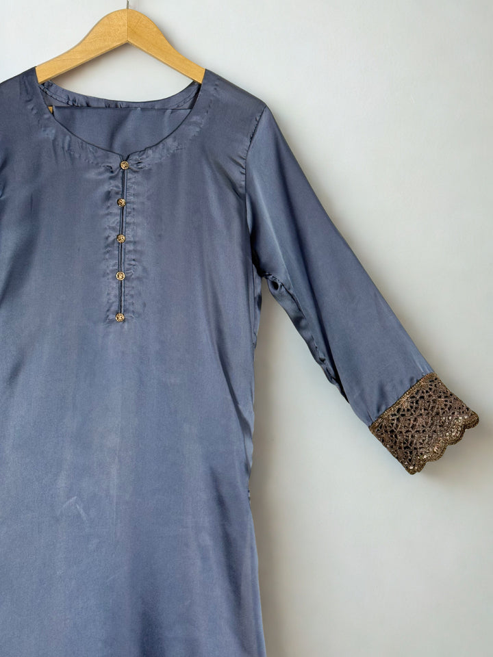 Cool Blue Plain Silk Dress With Fancy Lace on Sleeves